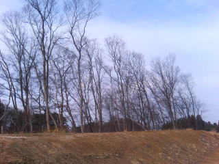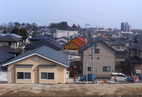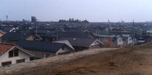 (南東方向)残っている岡の上から市街地を見る。正面の森は竹駒神社