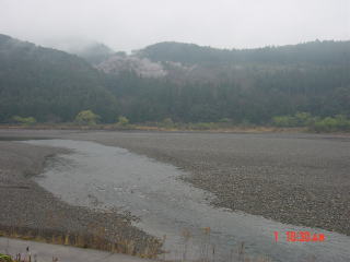 菜の花畑の右側の堰堤を行き、熊野川 昔は「音無川」