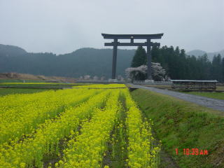 菜の花、鳥居の向こう、右手が旧社地 大斉原