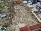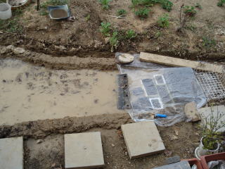 スコップで引っ掻き回し、板切れで泥面を平らにする。