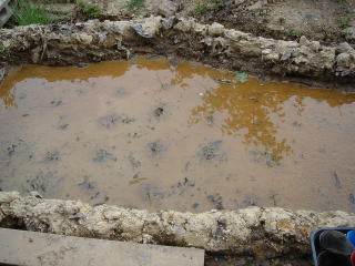 もともと粘土質の土壌、穴をほって、水を貯めてどろどろにする。畦も固めて