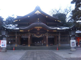 入り口の大きな赤い鳥居から歩くと、何故か拝殿への参道はクランク形に曲がる? そこに見事な黒松が二つ!!