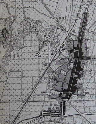本館の西側は丸沼が広がって。丸沼につづいて北方に沼が通じるが、これが長沼である。この長沼は梶橋のほうまで