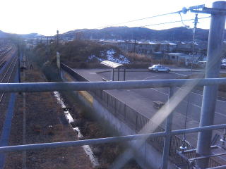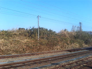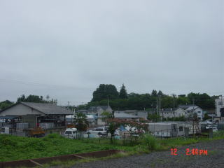 プラットホームの端っこから線路向こう、 北西方向 岩沼館本館跡丘を見る。