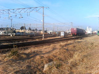 線路の前で、右手方向 岩沼駅構内を望む。このあたりは往古の