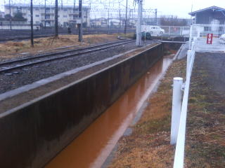 雨の中、丸沼の名残の流れにそって行くと、駅の南で線路を横切るように