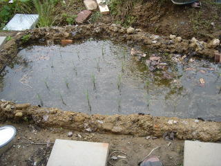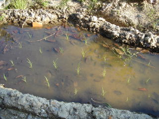 田植え後 約2週間 順調 2006/05/26 ビオトープ目指して 近所の池からオタマジャクシを取ってきて放つ 木の葉の陰や、泥に潜ったのか、一見してもどこにいるかはわからないけど。